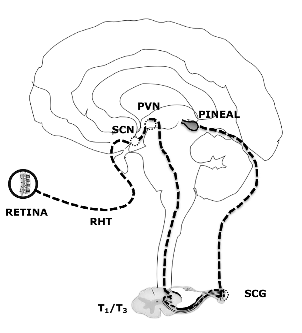 Şekil 1: Melatonin epifizdeki sentezinin kontrolü. Gözün retina tabakasında algılanan ışık hipotalamusun suprakiyazmatik ve paraventriküler çekirdeklerinde işlenir. Bilgi omurilik torakal (sırt bölgesi) 1-3 seviyesine giden sinir lifleri aracılığıyla üst sempatik gangliyona (superior sempatik gangliyon) iletilir ve oradan epifiz bezine gönderilir. Yani melatonin sentezini gerçekleştiren sempatik sistemin çalışmasıdır. Kısaltmalar: SCN: suprakiyazmatik çekirdek, PVN: paraventriküler çekirdek, Retina: gözün sinir tabakası, RHT: retinadan hipotalamusa giden yolak, T1/T3 omurilik seviyesi, SCG: üst sempatik gangliyon, pineal: epifiz bezi. Kaynak: Arch Endocrinol Metab, 2018; 62/4, 472-479.